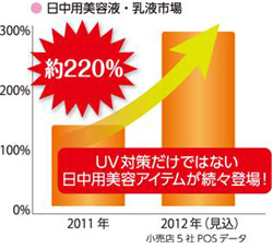 日中のお肌は、紫外線や皮脂の酸化・乾燥などによってダメージを受け、しわやたるみ、くすみ、毛穴つまり、テカリや化粧崩れといった肌ダメージを引き起こします。これに対応する日中用美容アイテムが次々に発売され、市場は好調に。