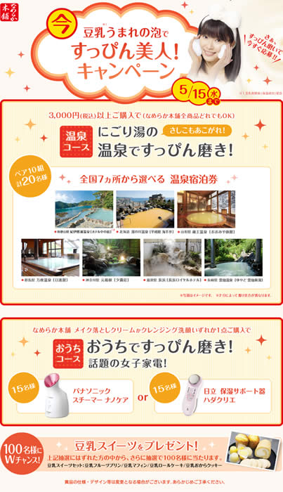 キャンペーンでは、期間中『なめらか本舗』の対象商品をお買い上げいただいた方の中から抽選で、合計150名様に“にごり湯の温泉ですっぴん磨き!”“おうちですっぴん磨き!”をサポートする豪華賞品をプレゼントいたします。