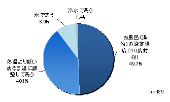 一般的に、「洗顔は水もしくは体温より低いぬるま湯で行うとよい」とされていますが、49.7%の人がお風呂の設定温度(40度前後)で洗顔している事がわかりました。