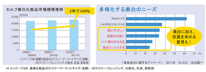 美白商品が増加するに伴い、ニーズも多様化し、透明感だけでなく、弾力ある肌の質感も求められています。