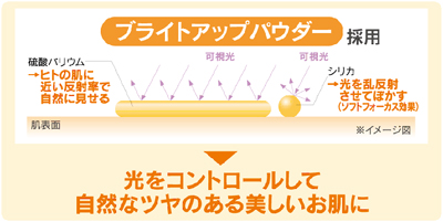 ヒトの肌に近い光の反射率をもつ硝酸バリウムと、光を乱反射させてぼかす効果(ソフトフォーカス効果)のあるシリカ配合で、光をコントロールし、自然なツヤのある美しいお肌に仕上げます。
